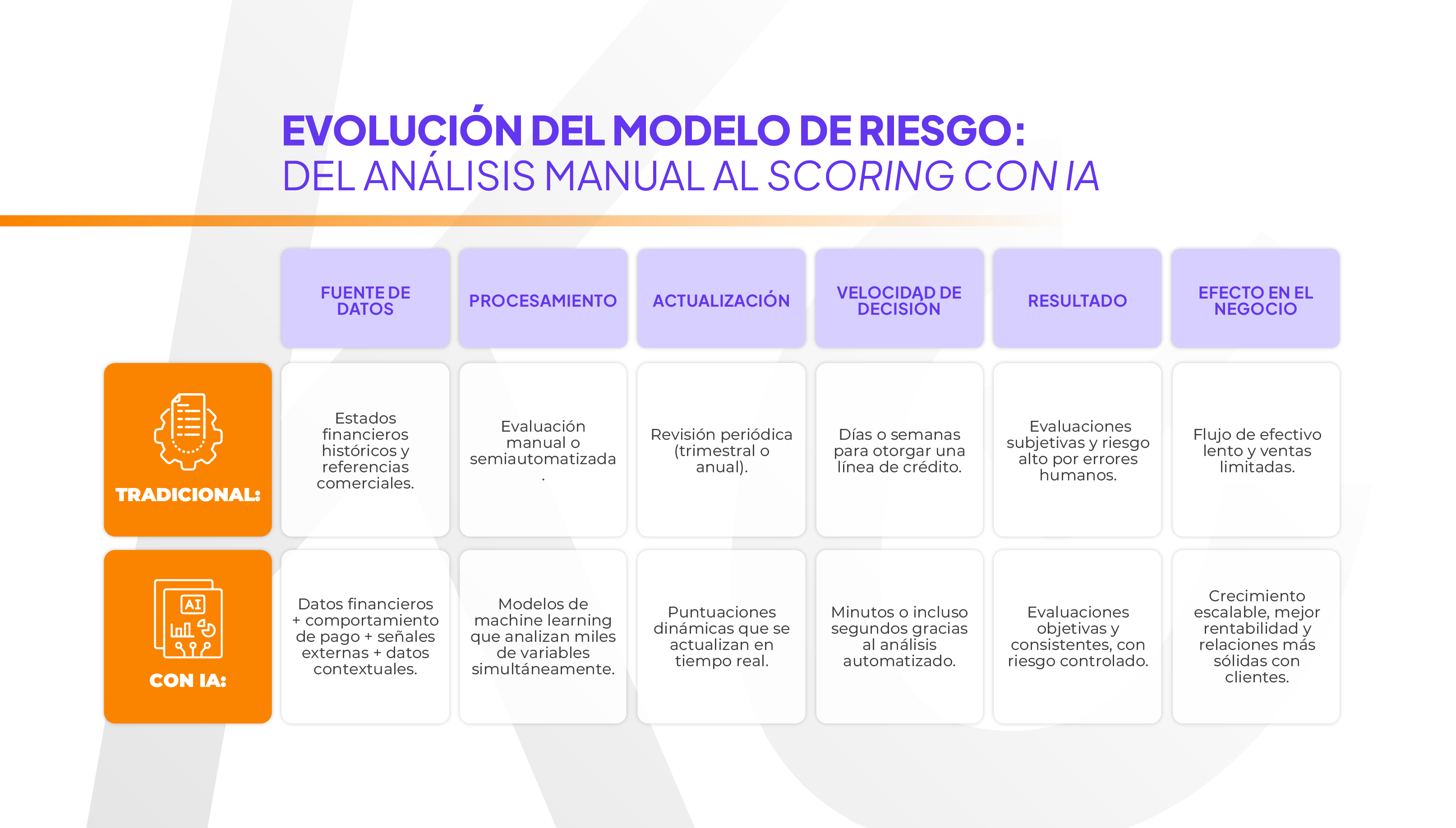• Falta de actualización: los modelos tradicionales no detectan cambios en el comportamiento de pago del cliente en tiempo real. Si un cliente empieza a retrasarse, la empresa suele enterarse demasiado tarde.